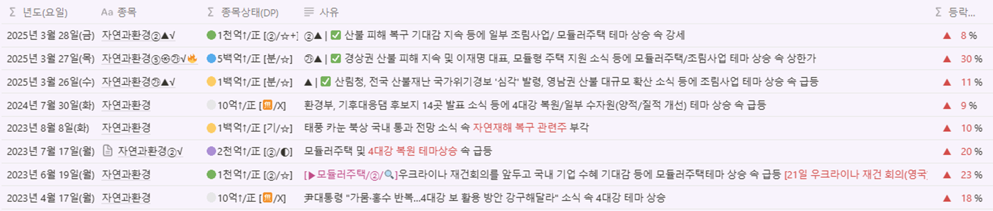 🟡1백억↑/正 [②/○] | ②㉮▲ | ✅ 산불 피해 복구 기대감 지속 등에 일부 농업 테마 상승 속 급등 | ▲ 10 % |