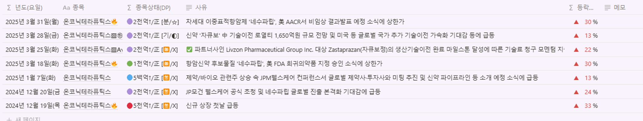 | 온코닉테라퓨틱스🔥 | 🟣2천억↑/正 [분/☆] | 차세대 이중표적항암제 '네수파립', 美 AACR서 비임상 결과발표 예정 소식에 상한가 | ▲ 30 % |