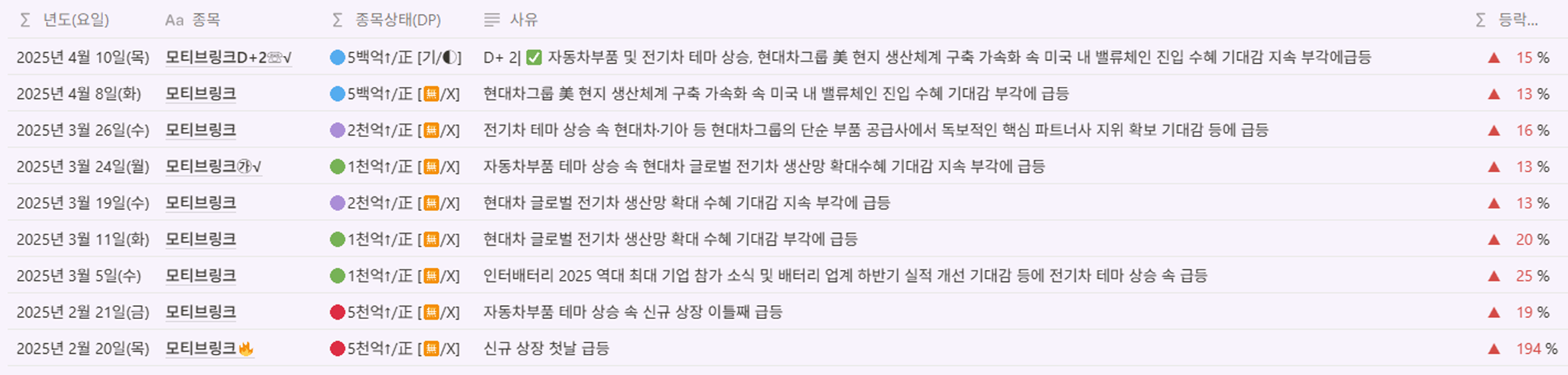 | 모티브링크D+2☏√ | 🔵5백억↑/正 [기/◐] | D+ 2| ✅ 자동차부품 및 전기차 테마 상승, 현대차그룹 美 현지 생산체계 구축 가속화 속 미국 내 밸류체인 진입 수혜 기대감 지속 부각에급등 | ▲ 15 % |