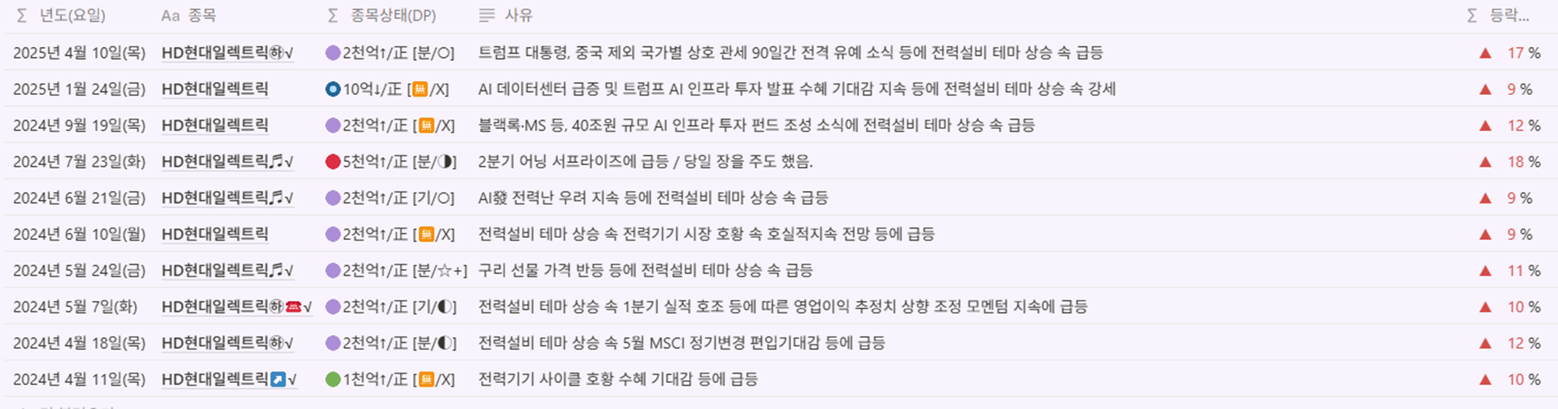| 효성중공업 | 🟡1백억↑/正 [🈚/X] | 트럼프 상호관세 90일 유예 소식에 전력설비 테마 강세 | ▲ 13 % |