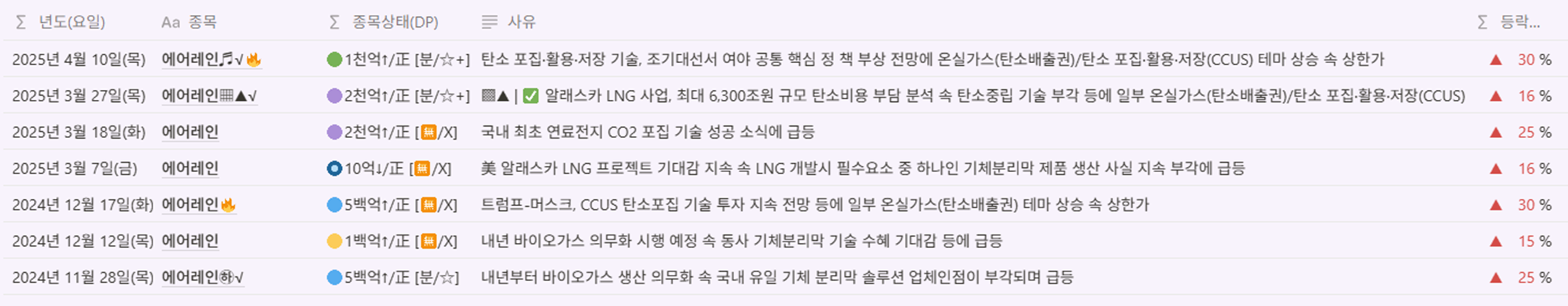| 에어레인♬√🔥 | 🟢1천억↑/正 [분/☆+] | 탄소 포집·활용·저장 기술, 조기대선서 여야 공통 핵심 정 책 부상 전망에 온실가스(탄소배출권)/탄소 포집·활용·저장(CCUS) 테마 상승 속 상한가 | ▲ 30 % |
